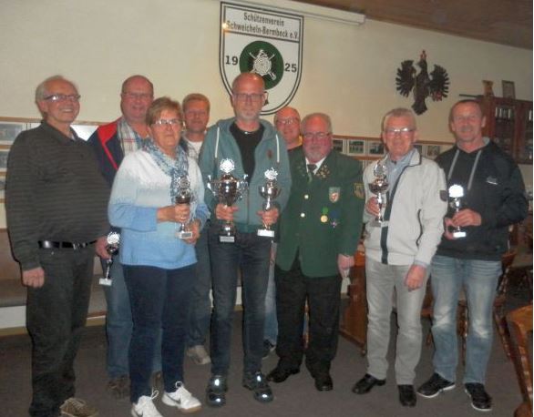 Das diesjährige Schießen fand in Schweicheln statt. 7 ehemalige Könige nahmen in diesem Jahr teil. Leider überschnitt sich der Termin mit einigen vereinsinternen Veranstaltungen der anderen Vereine. Trotzden wurde es ein schöner Abend. Als Sieger ging Frank Komnick vom SV Schweicheln hervor. Er siegte vor Friedhelm Schmitt vom SV Lenzinghausen und Brigitte Wöhrmann vom SV Löhne-Obernbeck. Auf den weitern Plätzen folgen Thorsten Schröder aus Schweicheln und Andreas Baczewski vom SV Winterberg. Die beiden weiteren Plätze gingen an die Schweichelner Mario Möller und Sven Rahlmeier. Die Pokale für die erfolgreichen Schützen wurden vom Kreisvorsitzenden Ulrich Brünger und seinem Stellvertreter Heinz Hägerbäumer übergeben.